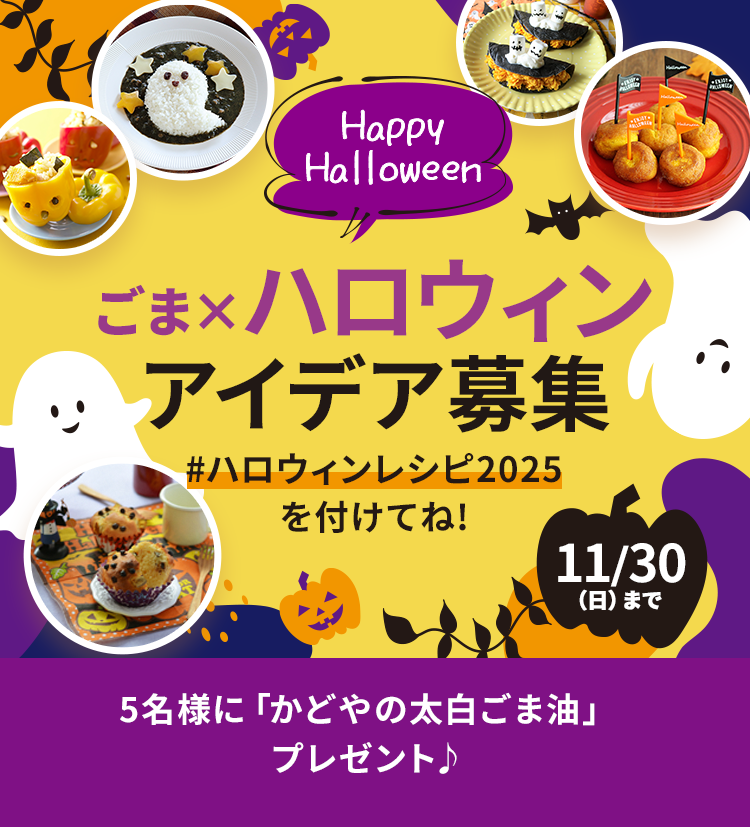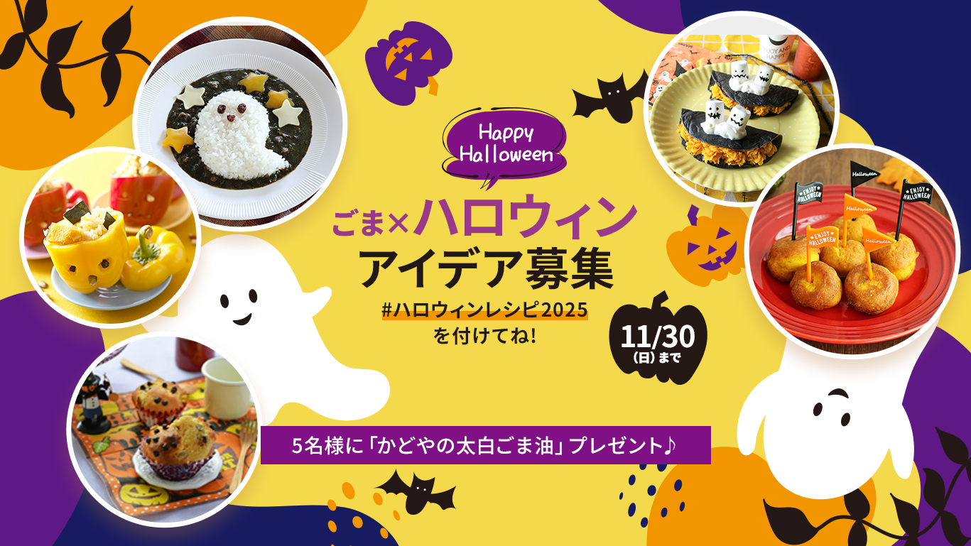 ごまっ子の皆さん、こんにちは! ごまラボ担当ふゆです。 街のあちこちがオレンジ色に染まり、ちょっぴりワクワクする季節がやってきました。 今回のテーマは―― 「ごま×ハロウィン」 ✨かぼちゃやおばけモチーフはもちろん、 ハロウィン気分を楽しめるおうちごはんやスイーツなどなんでもOK! 肌寒い日はごまのコクをきかせたあったかスープもいいかも♪ 香ばしいごまの風味で、ちょっと大人のハロウィンを楽しみましょう👻🖤 ごま油は料理にコクを追加して深みのある味わいにまとめてくれるので、食欲の秋にうってつけ。 ごまっ子の皆さんが考えたレシピで、ハロウィンを一緒に盛り上げましょう🎃「#ハロウィンレシピ2025」をつけて、 “ごま香るハロウィンレシピ”を投稿してくださいね🙌 皆さんの投稿を楽しみにしています!「みんなで創る」でもらえるポイント数はこちら>> 投稿期間終了後、事務局スタッフによる厳正な選考を行い、「アイデア賞」として5名様に、お菓子作りから普段の料理まで幅広く活用できる「かどやの太白ごま油」をプレゼント! 皆さんのアイデアをお待ちしております♪ ※投稿には、「ごまラボ」への会員登録(無料)が必須となっております。 ※こちらの記事への投稿は対象となりません。#ハロウィンレシピ2025 応募はこちら<応募概要> ◼︎応募期間 2025年10月21日(火) ~ 2025年11月30日(日)23:59まで ◼︎応募方法 レシピ投稿:ログイン後、[みんなで創る]にハッシュタグをつけて投稿する。 # ハロウィンレシピ2025 ※当選に関するお問い合わせにはお答えいたしかねます。 ※投稿には、「ごまラボ」への会員登録(無料)が必須となっております。 ※投稿カテゴリは自由です。(レシピの場合は「ごまレシピ」で投稿をお願いします) ◼︎賞品 アイデア賞:かどやの太白ごま油 ◼︎当選人数 5名 ◼︎当選者発表 ・厳正なる選考のうえ、当選者の方にのみ、2026年1月上旬頃に、ご登録のメールアドレスへご連絡いたします。 ・当選通知メールでお送りする配送先情報入力フォームで必ずご回答ください。こちらのご回答をいただけない場合、当選を無効とさせていただきます。 ・賞品は2026年2月上旬頃の発送を予定しております。 ------------------- <投稿について> ※「ごま製品」を使用し、応募者自身がつくったお料理の完成写真も一緒に投稿してください。 ※他企業や団体が運営するサイト・キャンペーン等で公表済みの料理写真の投稿はご遠慮ください。( ご自身のブログ、SNSでの公表は除きます ) ※第三者が見て、他企業や団体が運営するサイト・キャンペーン等で公表済みの料理写真と同一と認識する投稿はお控えください。 ※第三者の著作権や商標権等の権利を侵害するおそれのあるものは選考対象から外させていただきます。 ※他人が写り込んでいる写真を投稿いただく場合、写り込んでいる方全員の承諾を得た上でご応募ください。 ※不適切と判断した投稿は、非表示とさせていただく場合があります。 ※投稿いただいた内容は、「ごまラボ」、かどや製油株式会社のWebサイトや公式SNSアカウント、広告等にご本名は開示しない形で紹介および使用させていただくことがございます。 個別にお知らせすることはございませんので、あらかじめご了承ください。 <注意事項> ※電話やE-mail等による当選に関するお問い合わせには応じかねますので、ご了承ください。 ※プレゼントのご応募・お届けは、日本国内にお住まいの方に限らせていただきます。 ※長期間のご不在など、お品物をお受け取りいただけず弊社に返送された場合、再送付はいたしかねます。 ※賞品のお届け日のご指定はできません。 ※やむをえない理由により賞品内容を変更する場合がございます。 ※当選で獲得された権利は第三者への譲渡や換金は一切できません。 ※賞品の発送前に「ごまラボ」を退会された場合は、当選を無効とさせていただきます。 ※インターネット接続料及び通信料は、お客様のご負担となります。 ※かどや製油株式会社の社員および関係者は応募できません。 ※応募の際にご記入いただく個人情報は、「ごまラボ」の会員規約・利用規約にしたがって取扱います。 <お問い合わせ先> ごまラボ事務局 ※選考に関するお問い合わせにはお答えいたしかねます。