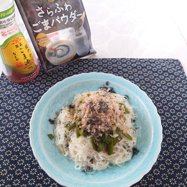 めかぶ1つを3つに分けて切り、熱湯でサッと茹で、刻んでめんつゆ大さじ1で和え、そうめんにかけ、鰹節とさらふわごまパウダーをトッ