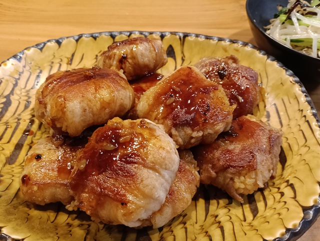 小さめおにぎりを豚バラ肉で巻いて、ごま油で焼き目をしっかりつけたら酒·砂糖·醤油で味付け。